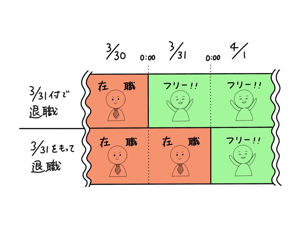 | 〇日付 | 3月31日付退職 | 3月31日になる0時00分から社員ではなくなる(3月30日まで在職)。 |