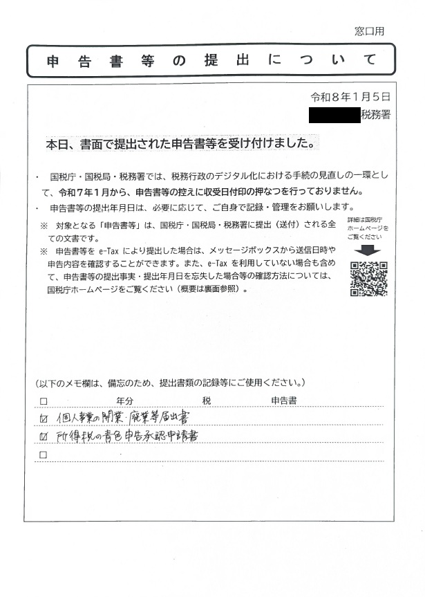 ですが、「自分が作ったPDFだけを出すのは不安」「念のため何らかの証拠が欲しい」という方は、税務署の窓口で「口座開設に使いたいので、受付票をください」と伝えると安心かと思います!